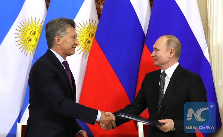 MOSCOW, Jan. 23 (Xinhua) -- Russian President Vladimir Putin and visiting Argentine President Mauricio Macri agreed on Tuesday to strengthen bilateral cooperation in a wide range of fields including trade, economic, investment, high technologies and humanitarian, a joint statement said.