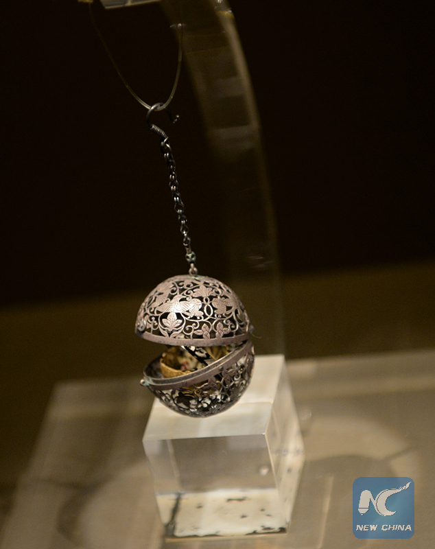 This object was made in the shape of a ball that was divided into two hollowed hemispheres with a pattern of flowers, honeysuckle, grapevines and four birds. Inside the lower hemisphere there are two concentric rings, which prevent the perfume inside from spilling.