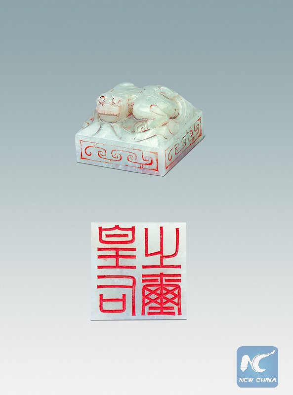 This seal of Hotan jade came from Xinjiang Uygur Autonomous Region. There a monster carved on top, and the seal is inscribed with 4 characters "Huang Hou Zhi Xi," which means it is an empress' seal. It was unearthed just 1 kilometer from Changling, the mausoleum of Emperor Gaozu, Liu Bang, and his wife Lyu Zhi. Therefore, it may have been used by Empress Lyu Zhi. The jade seal is one of the most important seals ever found.