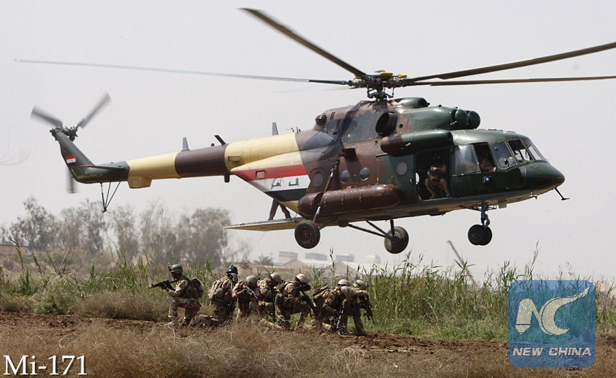 i soldiers take position as they disembark from an MI171 helicopter during a joint land and air training with U.S. soldiers north of Baghdad, March 29, 2010. (AFP PHOTO)