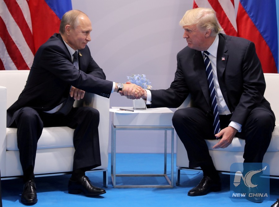 U.S. President Donald Trump shakes hands with Russia's President Vladimir during their bilateral meeting at the G20 summit in Hamburg, July 7, 2017.(Xinhua/REUTERS)