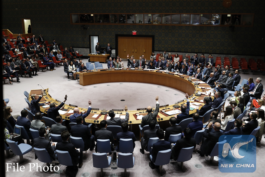 Photo taken on Sept. 11, 2017 shows the Security Council voting on a resolution on the Democratic People's Republic of Korea () at the UN headquarters in New York. (Xinhua/Li Muzi)