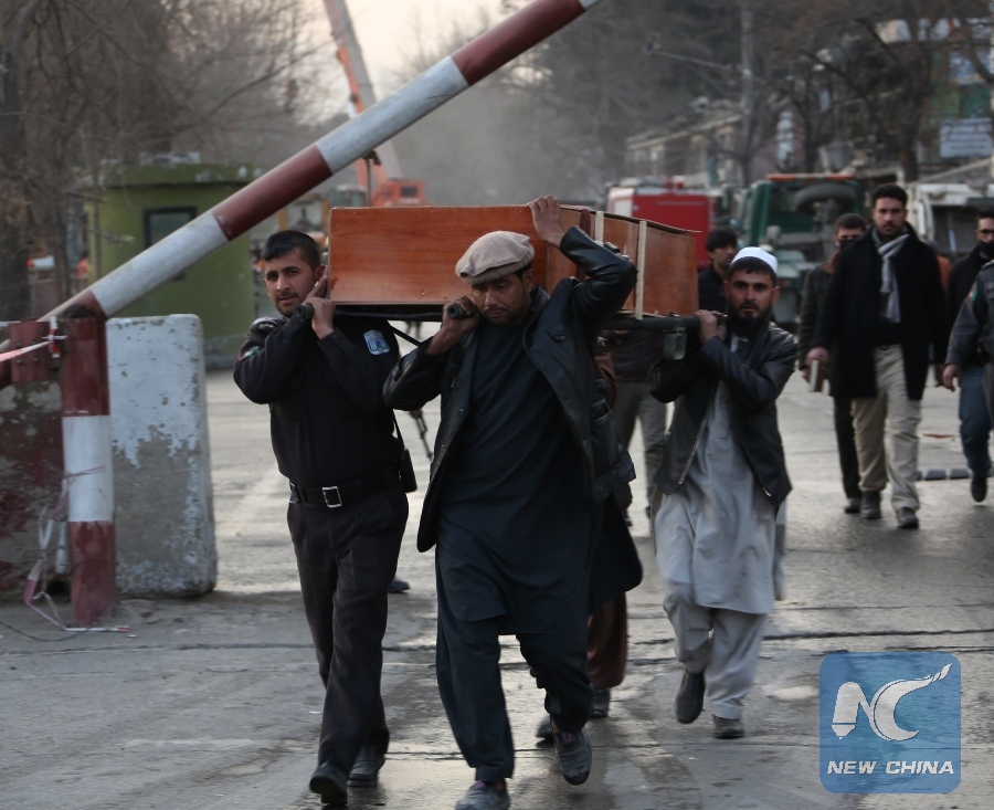 People carry a body of a victim from the blast site inKabul, , Jan. 27, 2018. Death toll from an explosive-laden ambulance detonated by a terrorist in Kabul on Saturday rose to 95, with 158 others wounded, according to a Public Health Ministry spokesman. (Xinhua/Rahmat Alizadah)