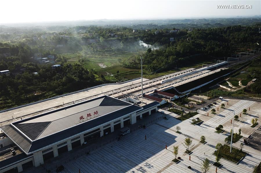 Photo taken on Sept. 10, 2017 shows a train running on Lanzhou-Chongqing railway, in the Guang'an section within southwest China's Sichuan Province. Lanzhou-Chongqing railway, a major railway connecting Lanzhou City in northwestern province of Gansu with the southwestern metropolis Chongqing, will fully open to traffic on Sept. 29, 2017, according to a press conference held by Lanzhou Railway Bureau Thursday. The railway, which started construction in 2008, also runs through northwest China's Shaanxi Province and southwest China's Sichuan Province. It will play a crucial role in improving transportation efficiency and advance the development program for western China. (Xinhua/Fan Peishen)