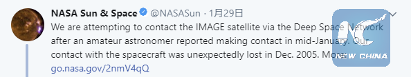 WASHINGTON, Jan. 29 (Xinhua) -- U.S. space agency NASA said Monday that it's attempting to contact a satellite it lost more than a decade ago, after it was discovered possibly still alive by an amateur astronomer earlier this month.