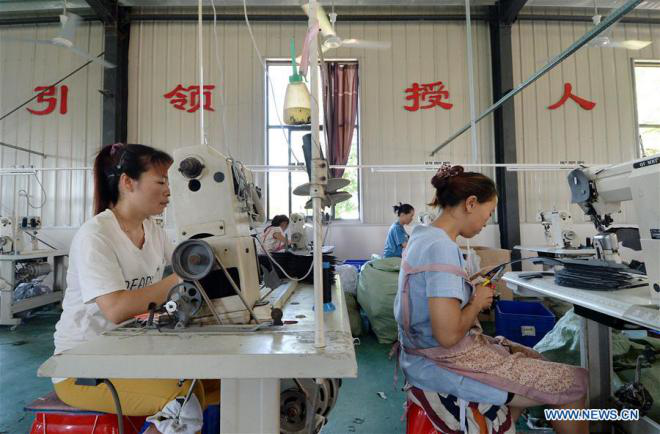 Villagers work in a poverty alleviation workshop of Tongjiang Village in Xiaosong Town of Shicheng County in Ganzhou City, east China's Jiangxi Province, July 22, 2017. Jiangxi Province worked hard in 2017 to win the battle against poverty. (Xinhua/Peng Zhaozhi)
