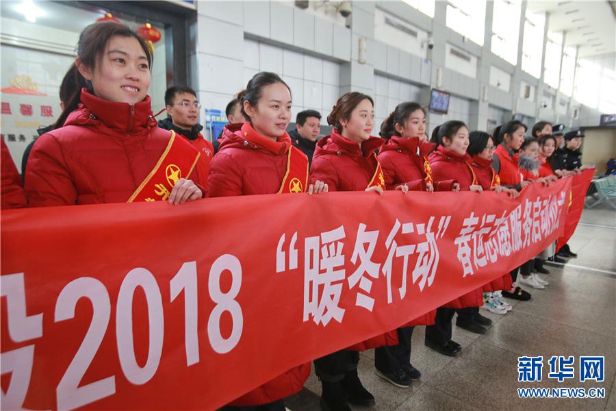 Photo taken on Feb. 1, 2018 shows volunteers at a launching ceremony of volunteer service for the Spring Festival travel rush at Kaifeng Railway Station, in central China’s Henan Province. (Xinhuanet/Li Junsheng)