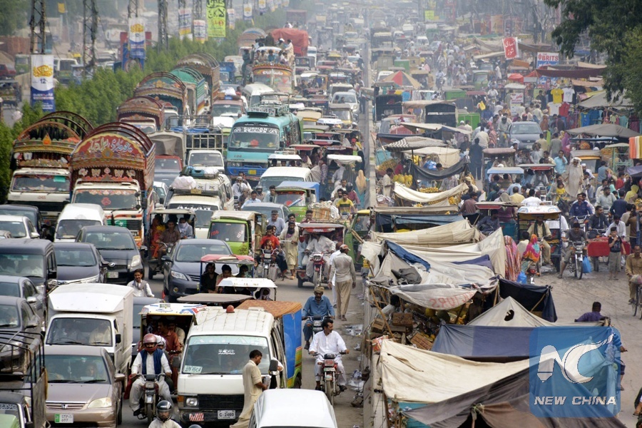 Photo taken on July 31, 2016 shows traffic jam on a busy road in eastern 's Lahore. (Xinhua/Sajjad)
