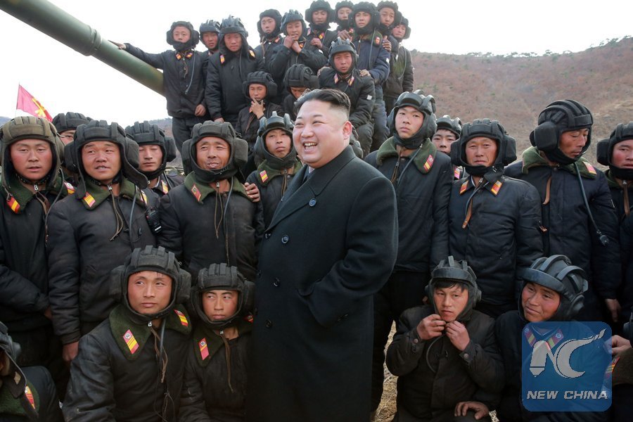 Photo provided by Korean Central News Agency (KCNA) on April 1, 2017 shows top leader of the Democratic People's Republic of Korea (DPRK) Kim Jong Un (Front) recently guiding the Korean People's Army Tank Crews' Competition-2017. (Xinhua/KCNA)