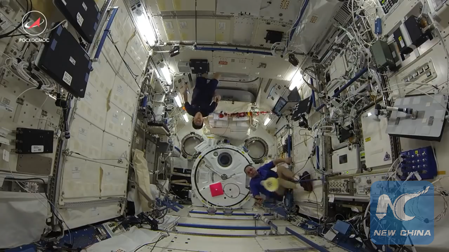 The photo taken from a footage published by 's state space corporation Roscosmos on February 6, 2018 shows a scene of the first badminton game on board the International Space Station played by astronauts from Russia, the and . (Xinhua/Roscosmos)