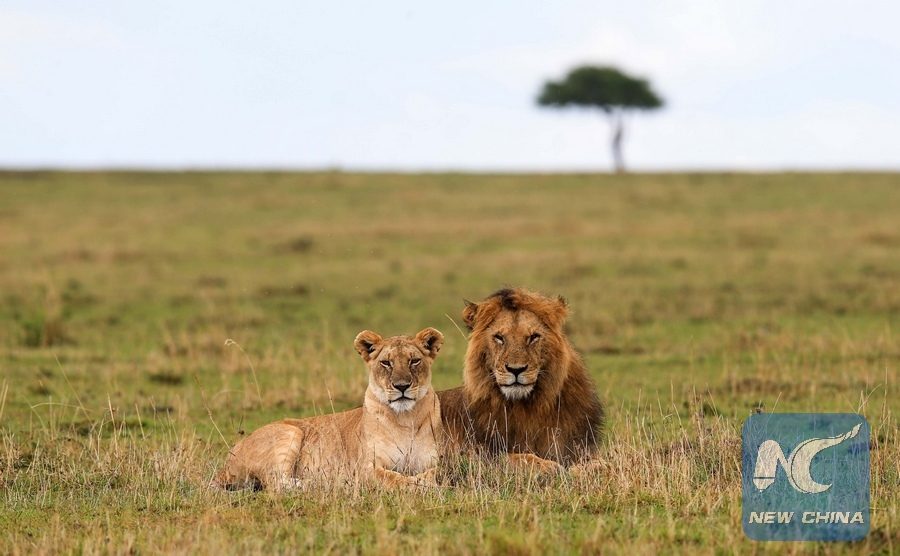 A lion couple enjoy cool air in the rain at the Maasai Mara National Reserve, Kenya, Nov. 23, 2013. To pursue food and water, a large number of wild animals made their second migration trip of this year to the Kenyan Maasai Mara National Reserve due to drought in Serengeti National Park of Tanzania. (Xinhua/Meng Chenguang)