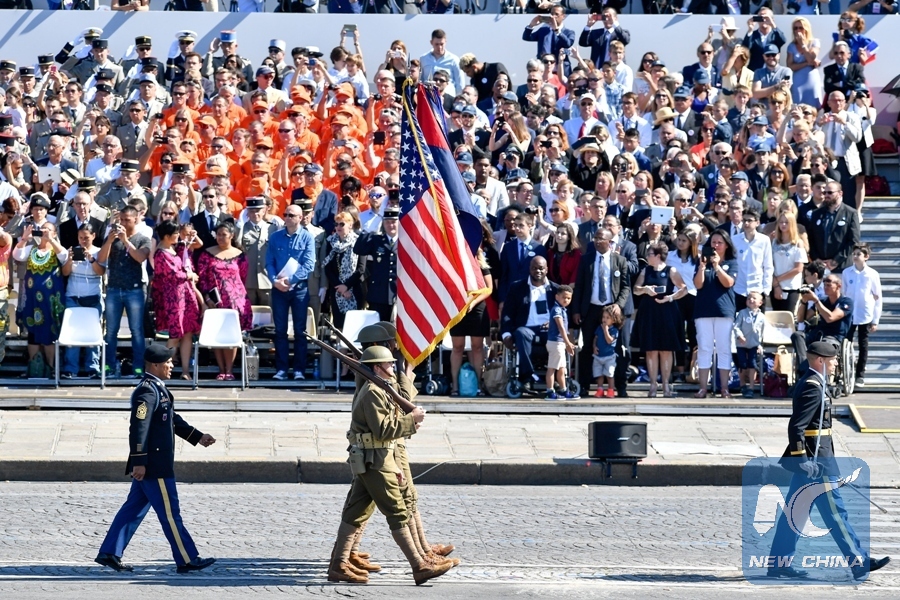 U.S. troops march during the annual Bastille Day military parade on the Concorde Square in Paris, , on July 14, 2017. (Xinhua/Chen Yichen)