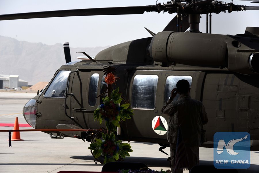 An Afghan security personnel stands beside a Black Hawk helicopter during a handover ceremony from the U.S. forces to the Afghan air force in Kandahar Province, south , Oct. 7, 2017. The U.S. forces has planned to hand over 159 military helicopters to the Afghan air force by 2021, an Afghan government official said. (Xinhua/Sanaullah Seiam)