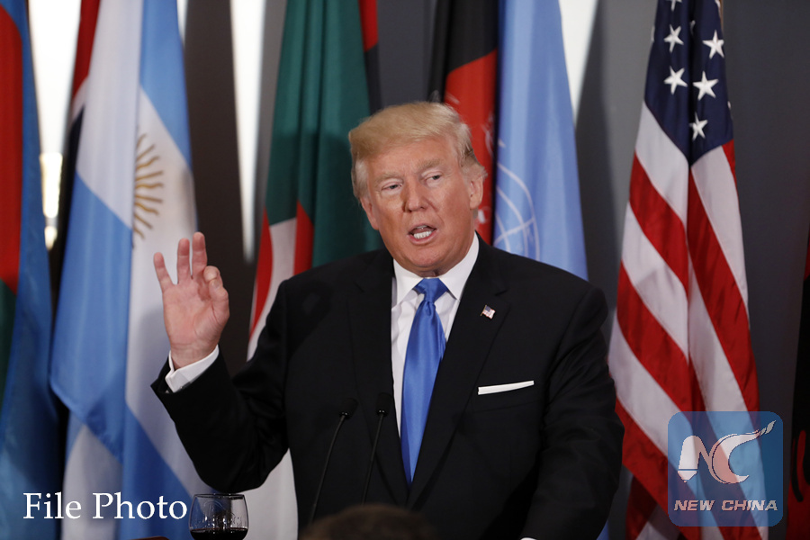 U.S. President Donald Trump speaks during a Heads of States Luncheon hosted by the Secretary-General Antonio Guterres, at the UN headquarters in New York, Sept. 19, 2017. (Xinhua/Li Muzi)