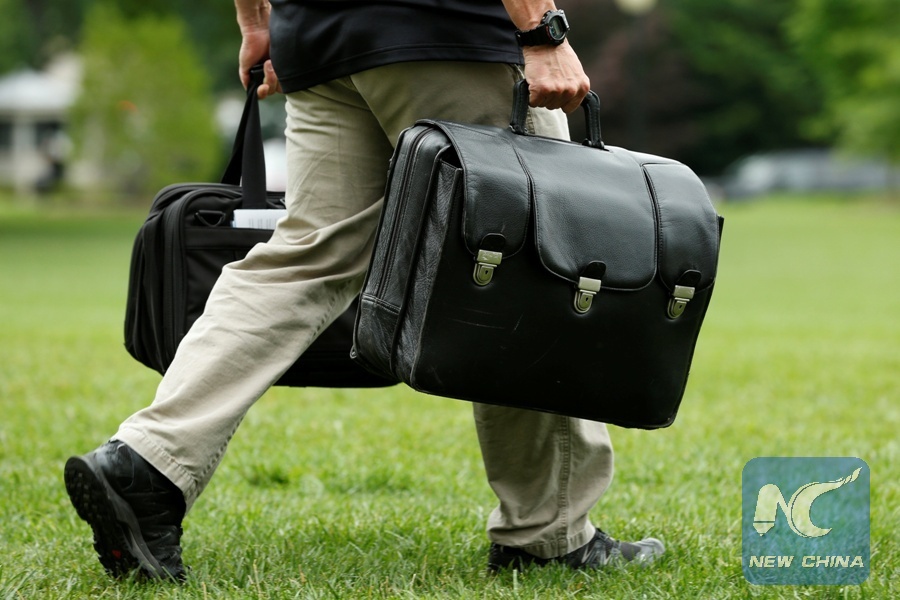An aide carries a case containing launch codes for nuclear weapons, following U.S. President Donald Trump on the South Lawn of the in Washington, U.S., before his departure to Camp David, June 17, 2017. (Xinhua/REUTERS)