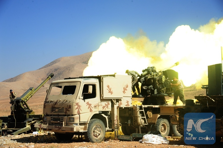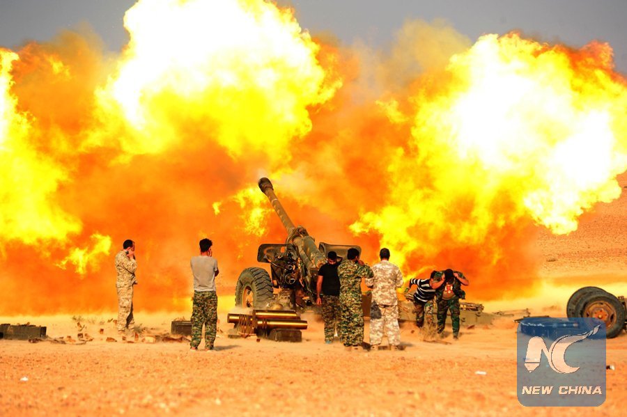 Syrian army soldiers fire an artillery on the Islamic State (IS) positions near the city of al-Bukamal in the eastern countryside of Deir al-Zour province, Syria, on Nov. 10, 2017. (Xinhua/Ammar Safarjalani)