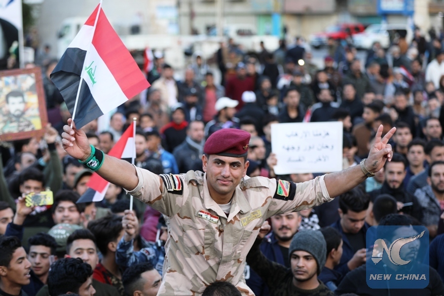 People celebrate the victory of the war against the Islamic State (IS) on Tahrir Square, Baghdad, Iraq, on Dec. 10, 2017. (Xinhua/Khalil Dawood)