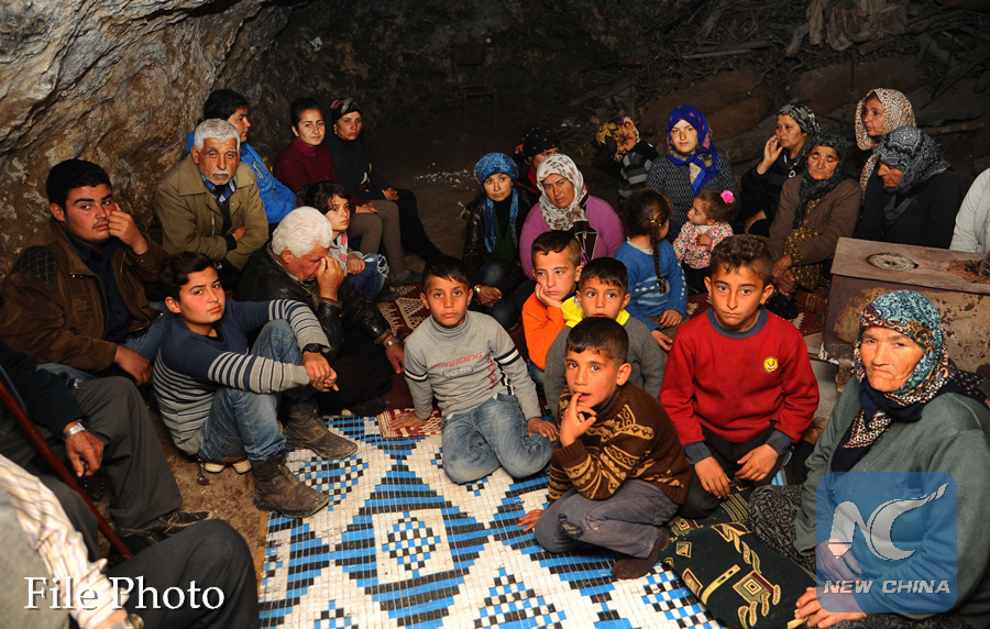 n Kurdish people stay in a cave in a village in the countryside of the Kurdish-controlled enclave of Afrin, northern Syria, on Feb. 8, 2018. Civilians in the countryside of Afrin have been fleeing their areas to safer places since the Turkish-led military campaign started against Kurdish fighters in Afrin. (Xinhua/Ammar Safarjalani)