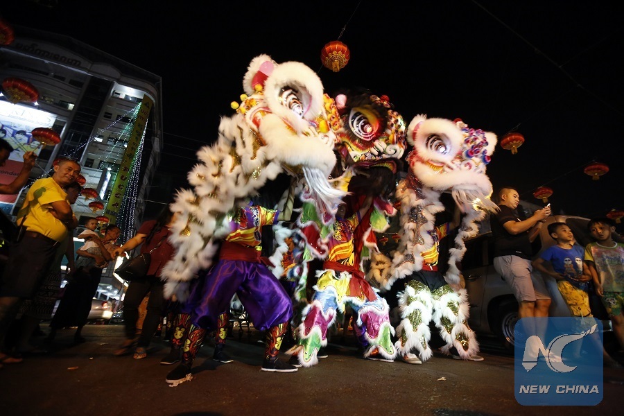 Dancers perform lion dance during a celebration for the upcoming Chinese Lunar New Year in the Chinatown of Yangon, Myanmar, Feb. 6, 2018. (Xinhua/U Aung)
