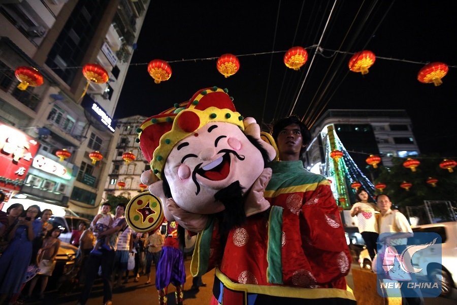 YANGON, Feb. 8 (Xinhua) -- The booming, rhythmic beating of drums captured the attention of scores of people in a popular shopping district just north of downtown Yangon, with the percussive euphony whipping up a festive atmosphere ahead of the traditional Chinese Spring Festival, or Chinese New Year.