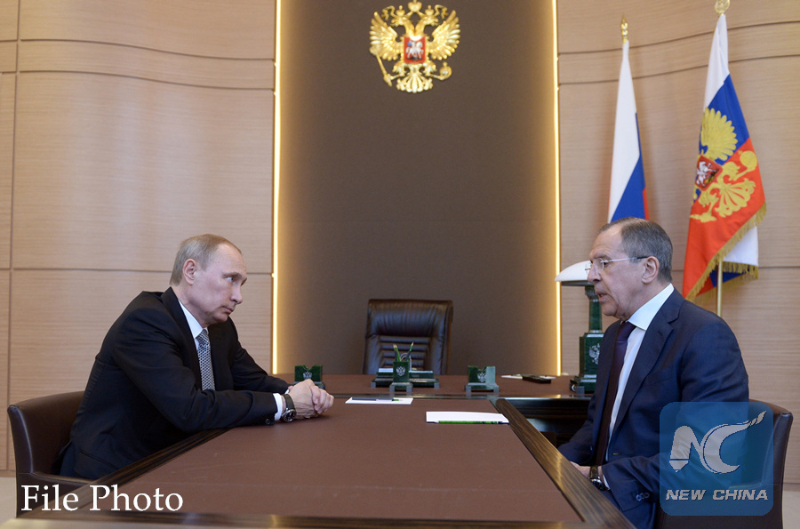 n President Vladimir , left listens to Foreign Minister Sergey Lavrov, right, during their meeting at the Bocharov Ruchei residence in Sochi, southern Russia, Monday, March 10, 2014. (Xinhua/AP)