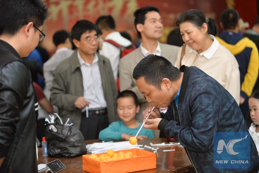 A Chinese man was trying to pick up a ping pong ball by using a straw on Feb. 9, 2018 in Addis Ababa, Ethiopia. The game was played during celebration of the upcoming Chinese Spring Festival by the Chinese community living in Ethiopia. (Xinhua/Michael Tewelde)