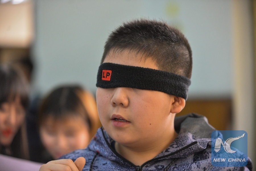 A Chinese child was blindfolded during a game of "walking a straight line" during celebration for the upcoming Chinese Spring Festival on Feb. 9, 2018 in Addis Ababa, Ethiopia. (Xinhua/Michael Tewelde)