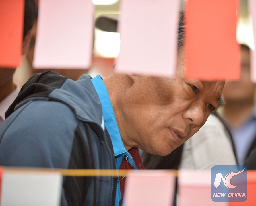 A Chinese man was trying to figure out the answers to Chinese riddles written on papers during celebration for the upcoming Chinese Spring Festival on Feb. 9, 2018 in Addis Ababa, Ethiopia. (Xinhua/Michael Tewelde)