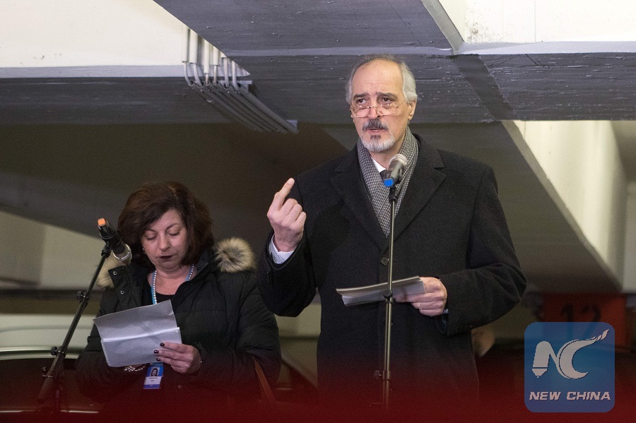 Bashar al-Jaafari, Syrian chief negotiator and Ambassador of the Permanent Representative Mission of Syria to the United Nations speaks to journalists after the talks on Syria in Vienna on January 26, 2018. (AFP Photo)