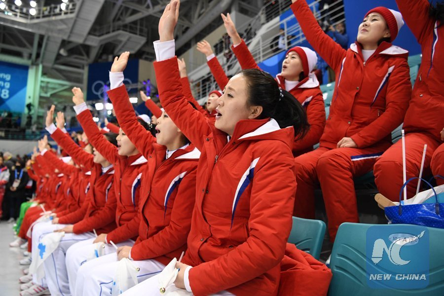 Cheerleaders from the Democratic People's Republic of Korea (DPRK) cheer during the preliminary match of women's ice hockey between Switzerland and the unified team of DPRK and South Korea at the Pyeongchang 2018 Winter Olympic Games at the Kwandong Hockey Centre in Gangneung, South Korea, on Feb. 10, 2018. (Xinhua/Wang Song)