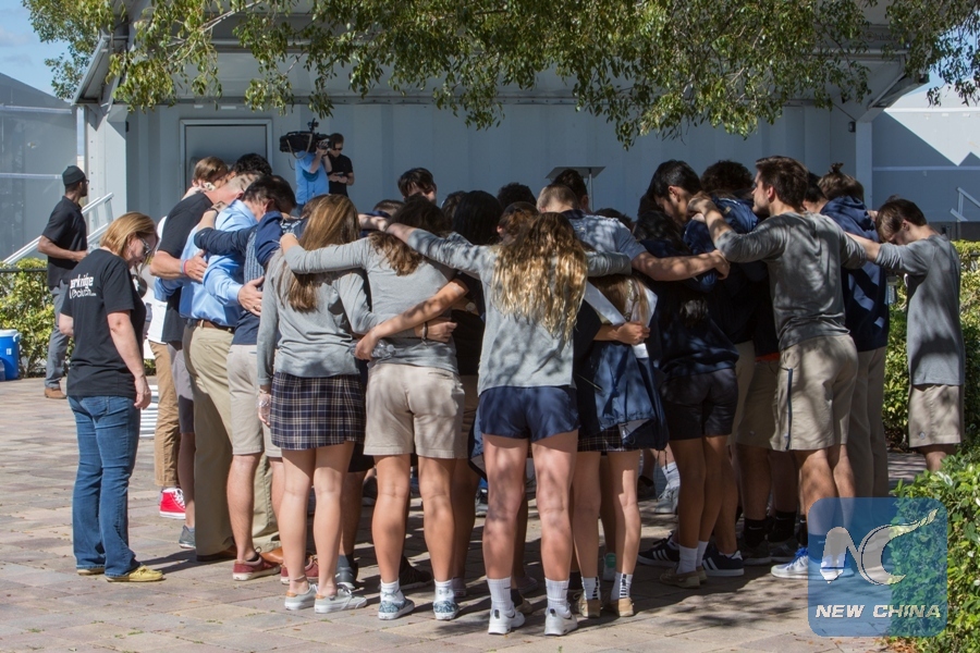 Community members share an emotional moment during a daytime prayer vigil at Parkridge Church in Parkland, Florida, the , on Feb. 15, 2018. A total of 17 people were killed and over a dozen others were wounded after a 19-year-old gunman opened fire Wednesday at the highschool, authorities said. (Xinhua/Monica McGivern)