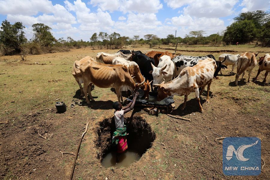 A herder stands in a water pool to collect water for his cattle in the drought-hit Laikipia County, Kenya, on March 1, 2017. (Xinhua/Pan Siwei)