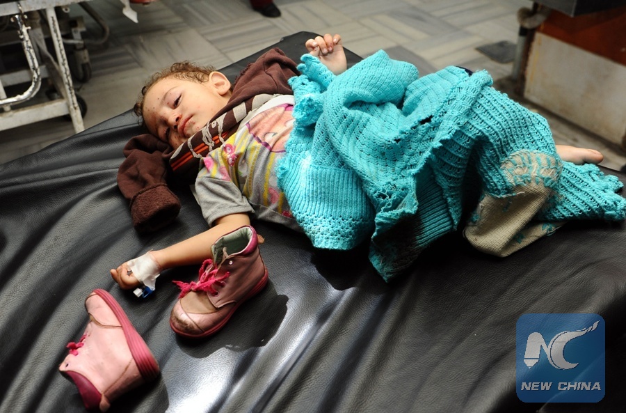 A wounded child is seen in a hospital in Damascus, capital of , on Feb.20, 2018. Tens of people have been taken to the hospitals Tuesday due to the intensified rebels' mortar attack that targeted several parts of Damascus as part of an ongoing military showdown between the rebels and the government forces. (Xinhua/Ammar Safarjalani)