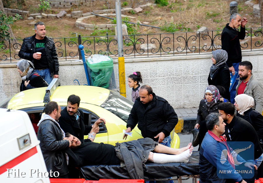 People get a wounded man into ambulance in Damascus, capital of , on Feb.20, 2018. (Xinhua/Ammar Safarjalani)