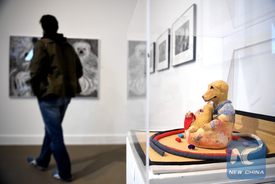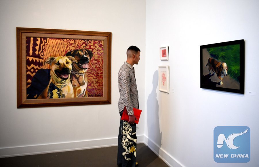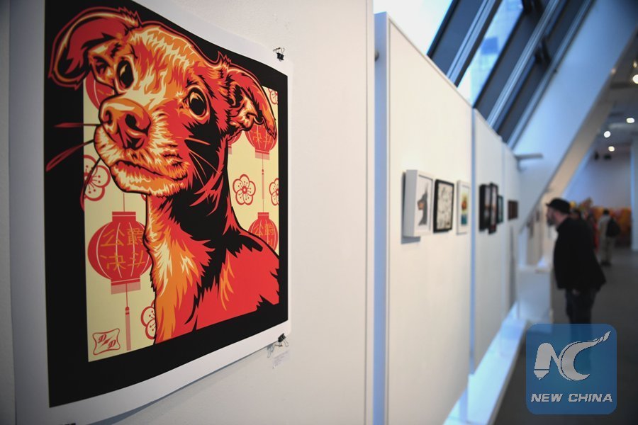People visit an exhibition at Chinese Culture Center of San Francisco in San Francisco, the , on Feb. 22, 2018. Chinese Culture Center of San Francisco celebrated Chinese New Year of the Dog with a dog-themed artwork exhibition. (Xinhua/Wu Xiaoling)