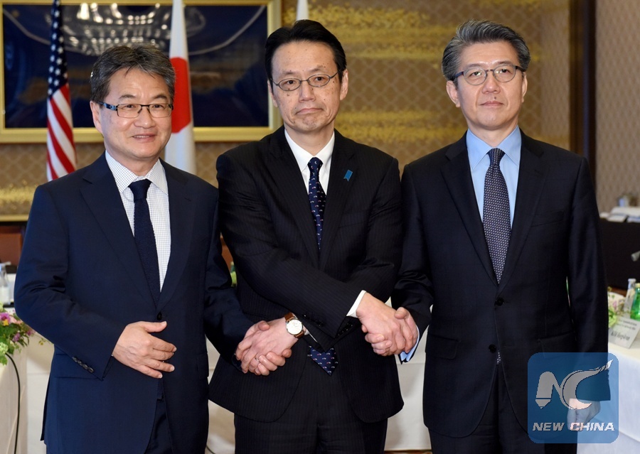 File Photo: (L-R) U.S. special envoy Joseph Yun, Japanese Foreign Ministry's Asian affairs chief Kenji Kanasugi, South Korean special representative Kim Hong-kyun shake hands during a meeting in Tokyo, Japan, April 25, 2017. The senior officials from the United States, South Korea and Japan met in Tokyo amid rising tensions with the Democratic People's Republic of Korea (DPRK). (Xinhua)