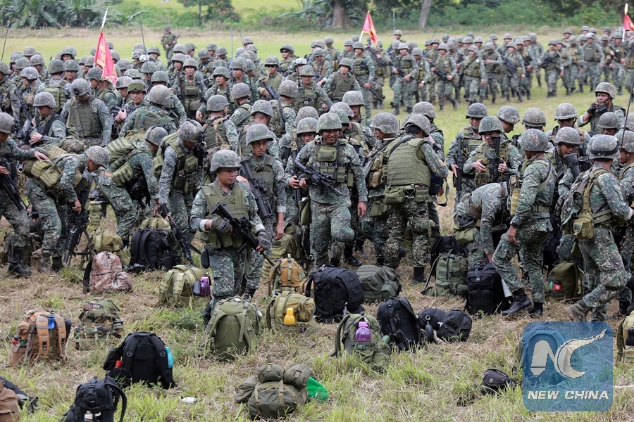 Soldiers from the Philippine Marine Battalion Landing Team (MBLT) and Marine Special Operation Group (MARSOG) gather their belongings after their send-off ceremony from their combat duty against pro-Islamic State (IS) militants in Marawi City, the , Oct. 21, 2017. (Xinhua/Rouelle Umali)