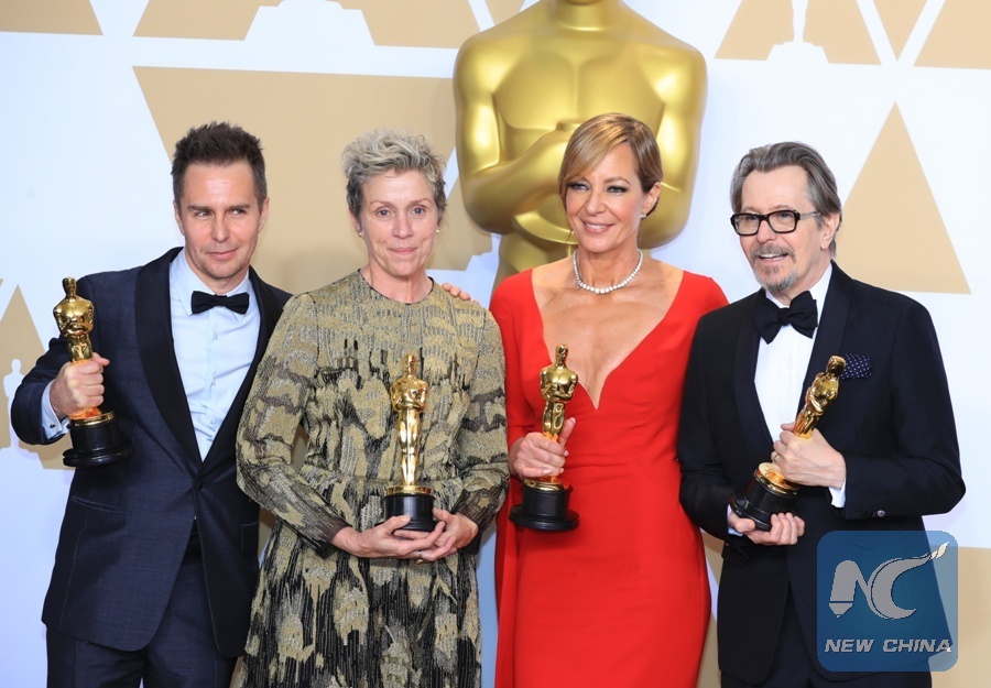 Oscar winners Sam Rockwell, Francis McDormand, Allison Janney and Gary Oldman (L to R) pose at press room of the 90th s at the Dolby Theater in Los Angeles, the , on March 4, 2018. (Xinhua/Li Ying)
