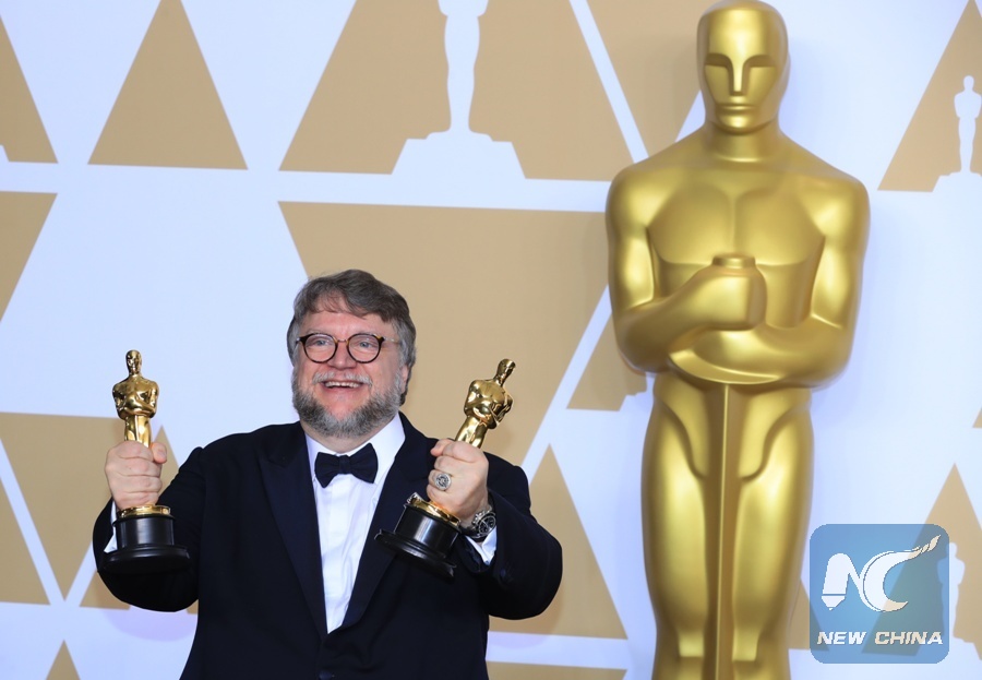 Director Guillermo del Toro poses after winning the Best Director award and the Best Picture award for "The Shape of Water" at press room of the 90th Academy Awards at the Dolby Theater in Los Angeles, the United States, on March 4, 2018. (Xinhua/Li Ying)