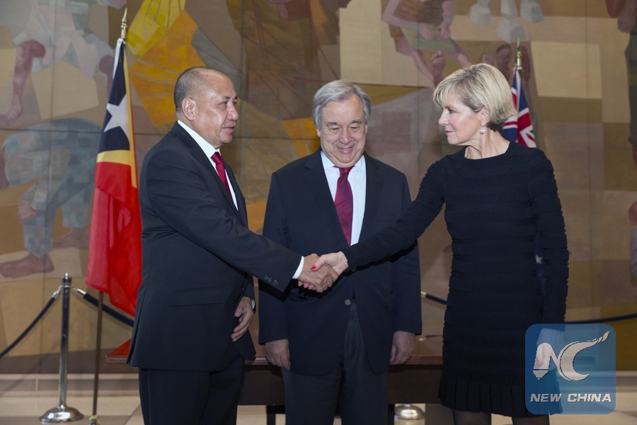 UNITED NATIONS, March 6 (Xinhua) -- Australia and Timor-Leste on Tuesday signed a historic maritime boundary treaty under the auspices of the United Nations, ending a decade-long maritime dispute and recognizing a permanent border between them.