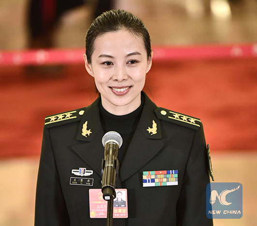 With her signature ponytail, a neat military uniform and a wide smile, Wang, together with another nine deputies to the 13th National People's Congress (NPC), met the press for the first "passage interview" arranged for the opening day of the annual political meeting on Monday.