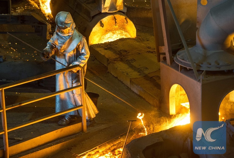 In this file photo taken on April 12, 2016, a worker agitates molten steel during the smelting and casting process at the Saint-Gobain PAM factory in France. (Xinhua/AFP)