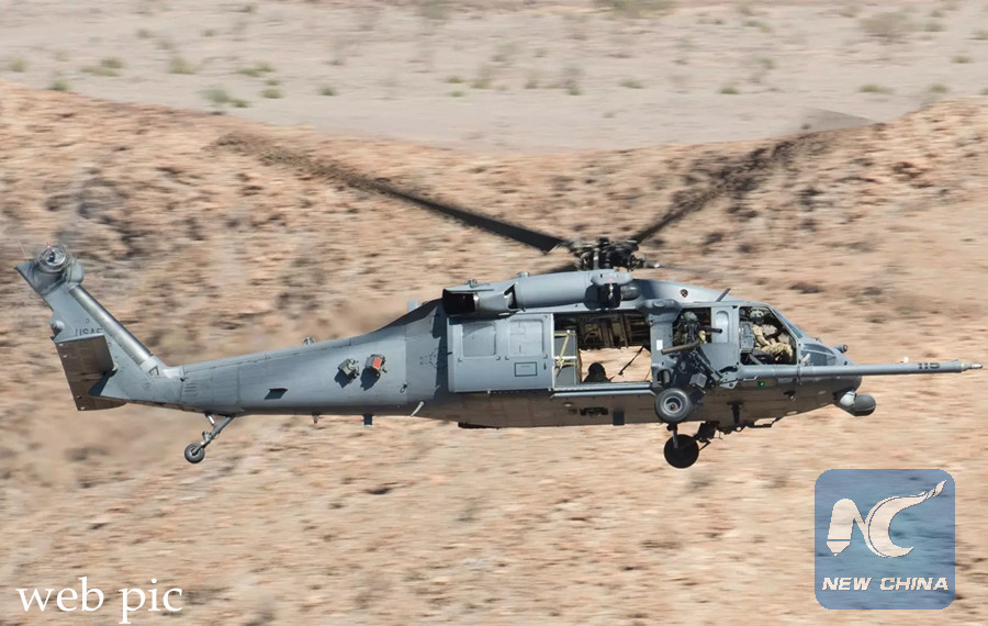 A helicopter of the U.S.-led international coalition, HH-60 Pave Hawk, crashes on March 16, 2018 in western Iraq near the border with Syria. (Web photo)