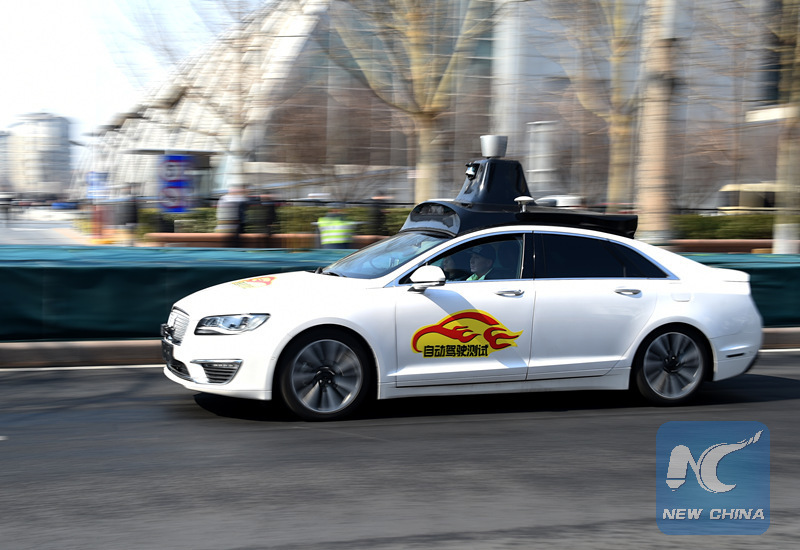 A self-driving car starts public road testing in Beijing. (Xinhua/Luo Xiaoguang)