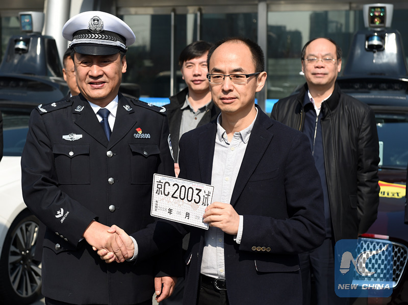 Beijing released its first temporary license plates for Baidu's self-driving vehicles for public road testing. (Xinhua/Luo Xiaoguang)