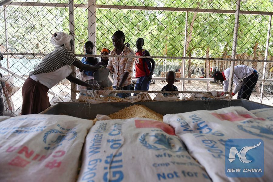 A worker of WFP distributes maize donated by Chinese government to refugees at Kakuma refugees camp in Kenya, June 7, 2017. (Xinhua/Sun Ruibo)