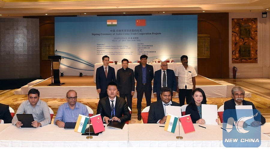 China's trade promotion group and India's Commerce and Industry Ministry attend the signing ceremony of India-China trade cooperation projects in New Delhi, India, March 24, 2018. (Xinhua/Zhang Naijie)