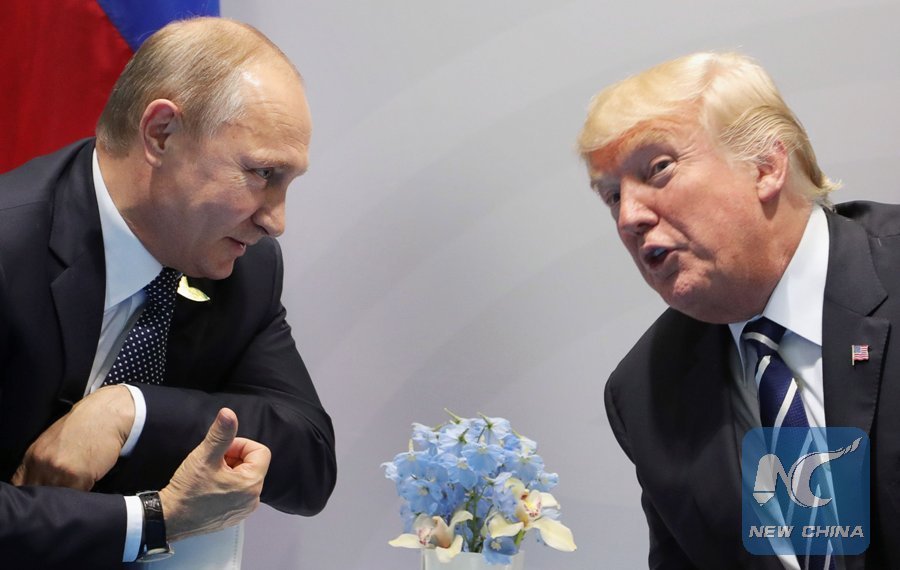 In this file photo taken on July 7, 2017, U.S. President Donald Trump (R) and Russia's President Vladimir Putin speak during their meeting on the sidelines of the G20 Summit in Hamburg, Germany. (Xinhua/AFP)