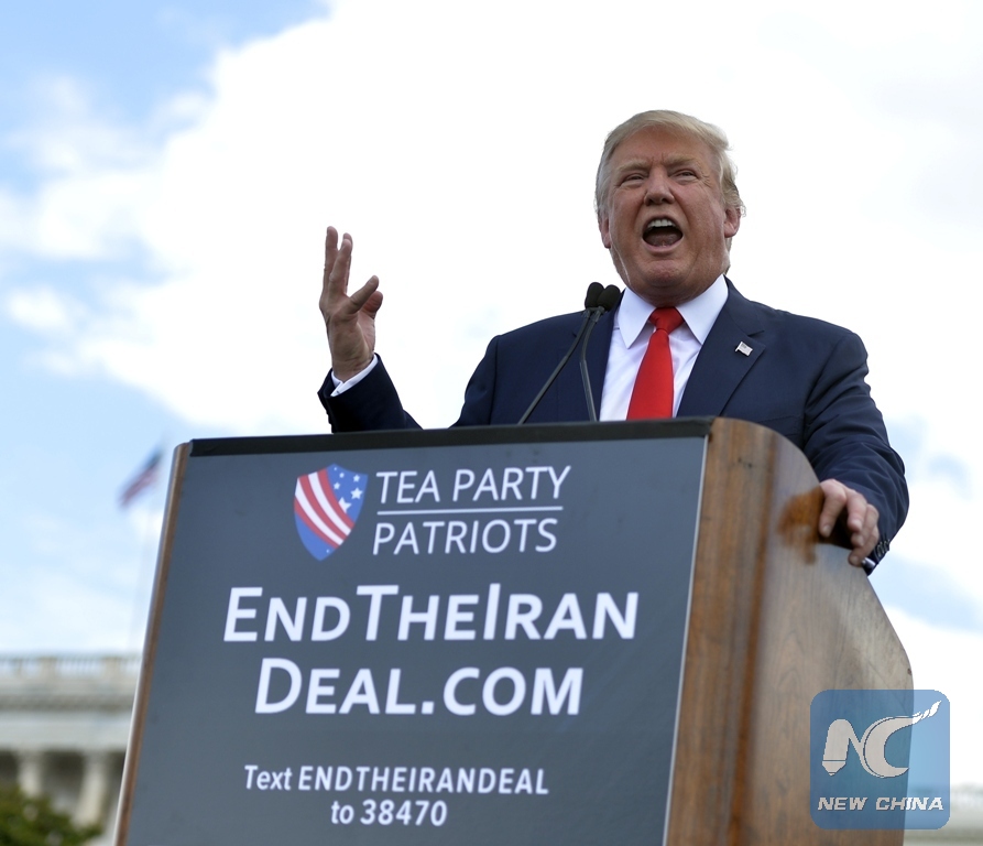 File Photo: U.S. Republican presidential candidate Donald Trump speaks during "Stop the Iran Deal" rally at West Lawn of the Capitol in Washington D.C., capital of the United States, Sept. 9, 2015. (Xinhua/Bao Dandan)