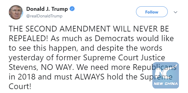 Trump tweets to dismiss a call to repeal the Second Amendment to the U.S. Constitution. (Xinhua)